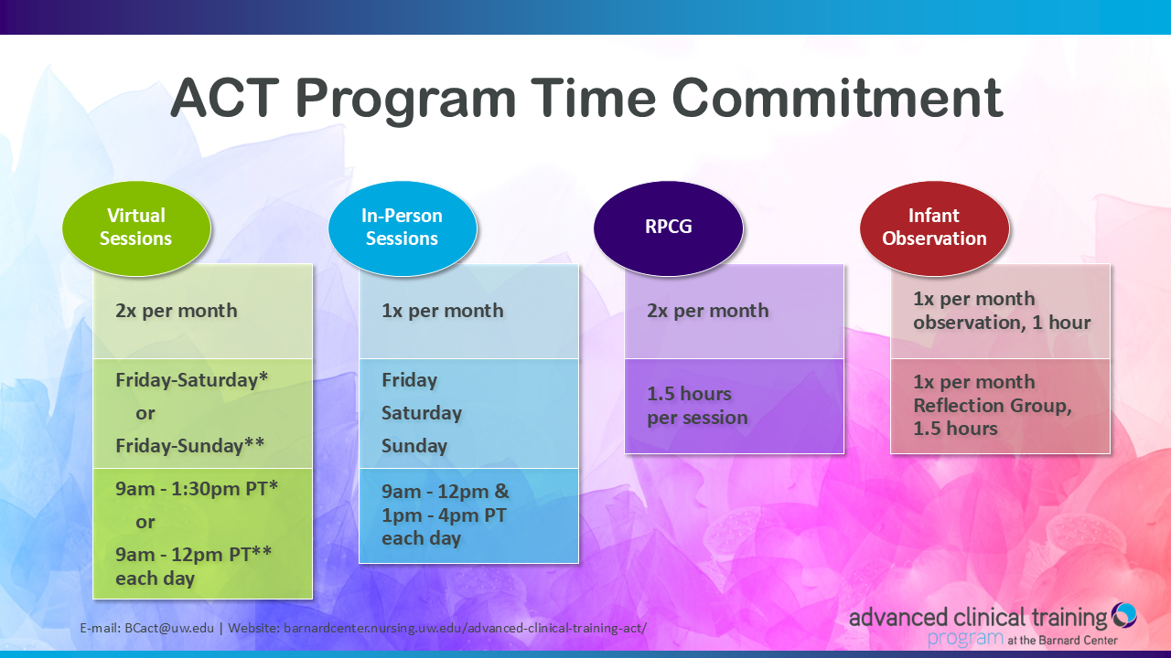 We encourage you to review the Program Schedule and the next cohort’s Tentative Calendar as you consider whether your participation in the ACT Program is a good fit for you at this time in your personal and professional life.